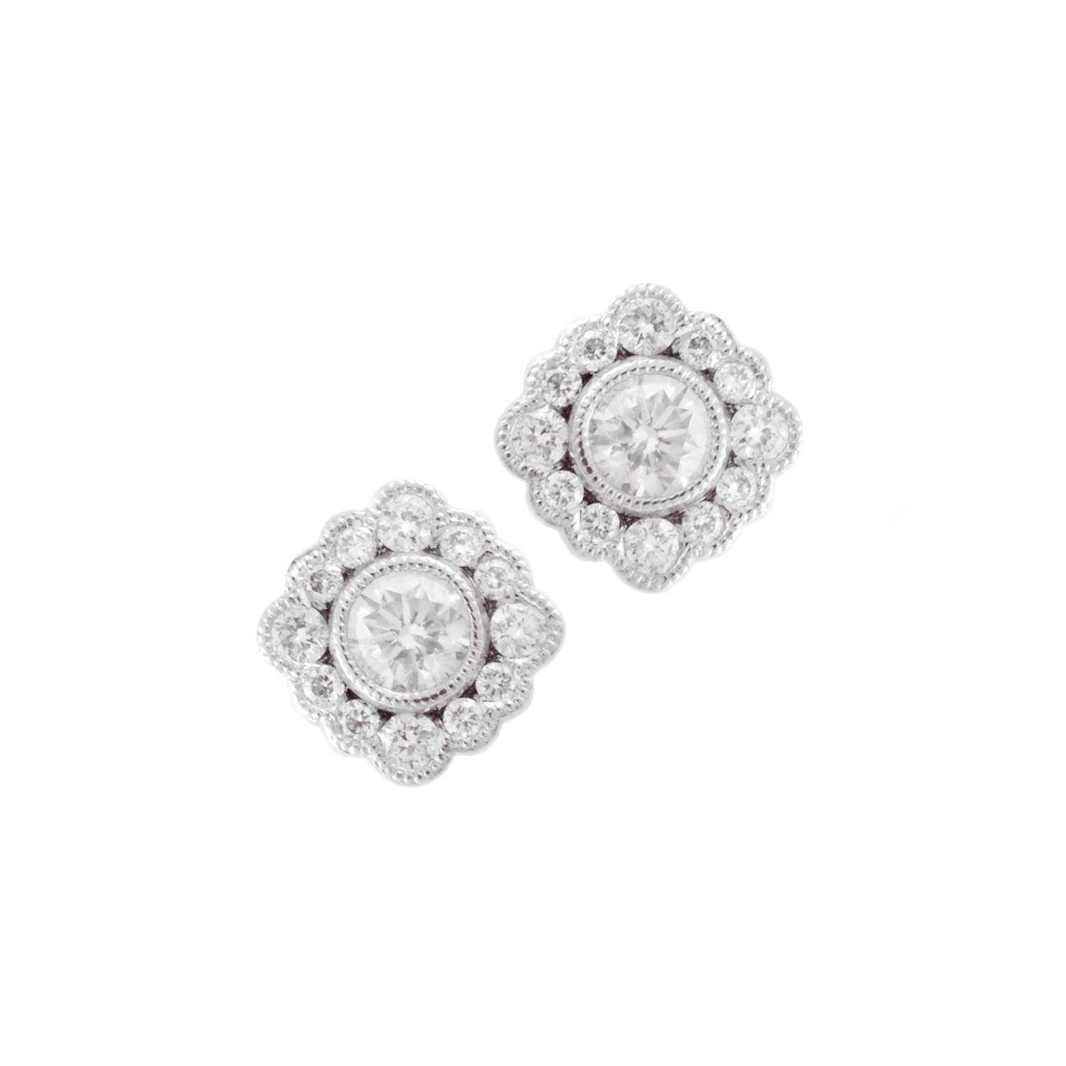 A pair of 18ct white gold round brilliant cut cushion shaped cluster stud earrings with millegrain settings, for pierced ears.