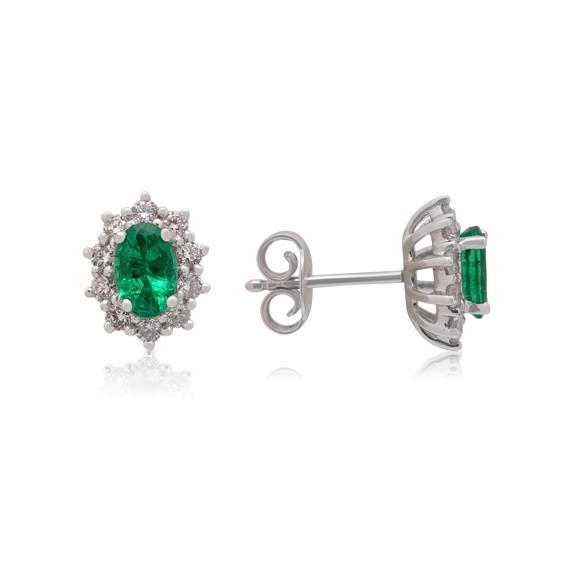 A pair of 18ct white gold oval emerald and diamond set cluster stud earrings, for pierced ears.