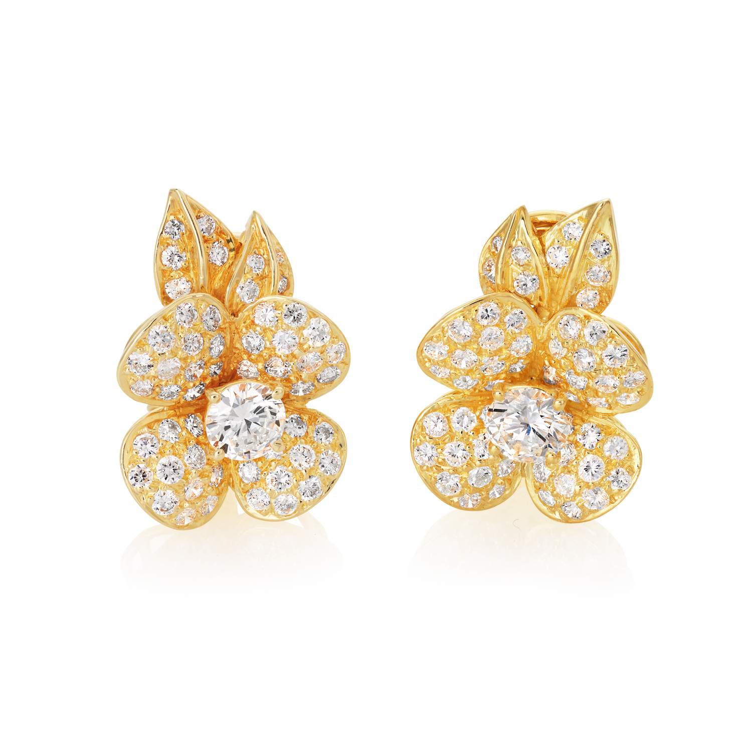A pair of 18ct yellow gold floral diamond cluster earrings on clip and post fittings, for pierced ears. Hallmarked London 1990.