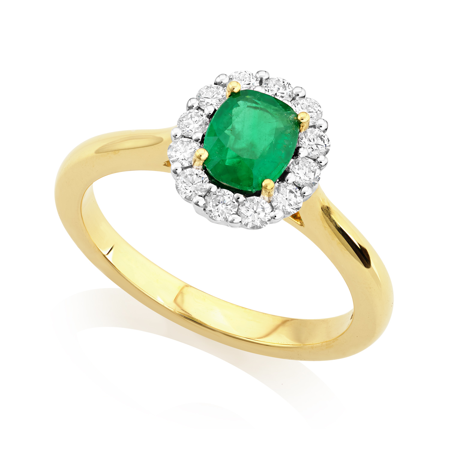 An 18ct yellow and white gold oval shaped emerald and brilliant cut diamond cluster ring. The central emerald is surrounded by twelve diamonds. Wedding ring friendly.