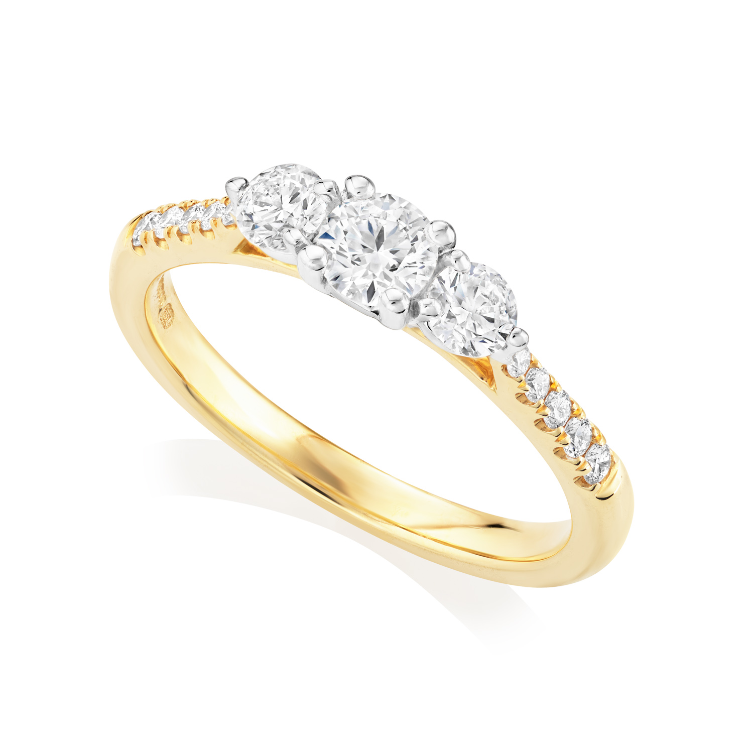 18ct Yellow & White Gold Round Brilliant Cut Three Stone Ring with Diamond Shoulders