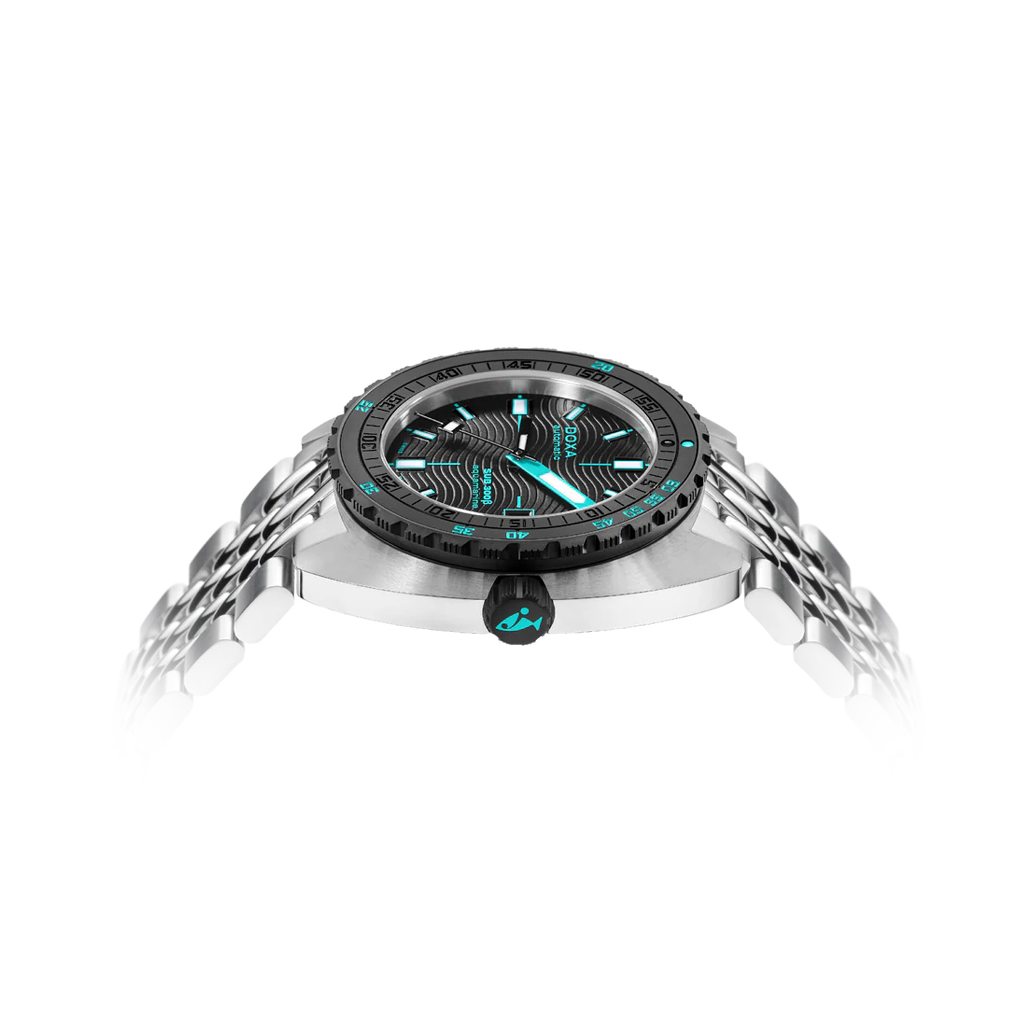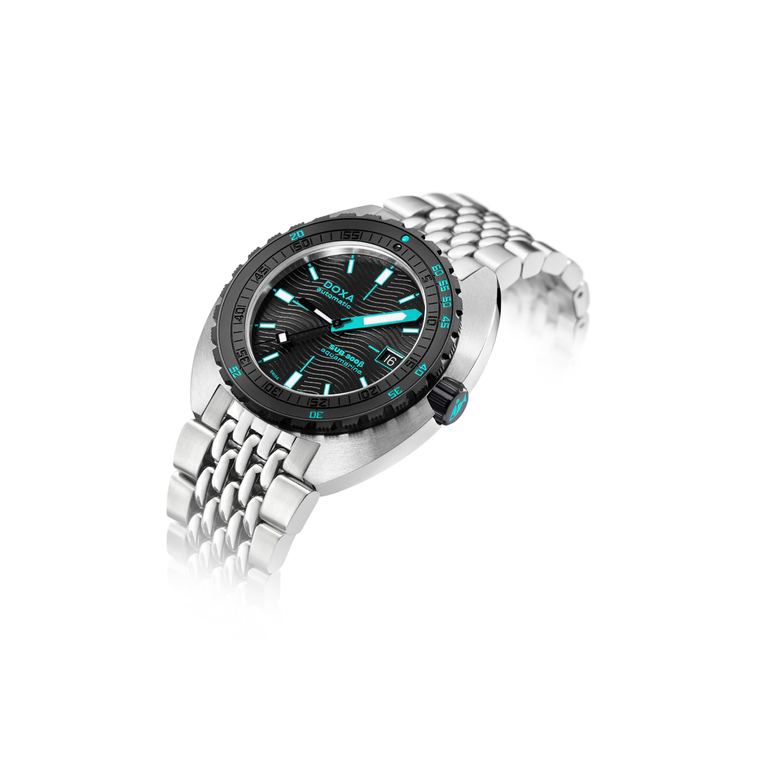 DOXA SUB 300Beta, Aquamarine with a 42.5mm stainless steel case and bracelet strap featuring a black dial and a black and aquamarine ceramic bezel.