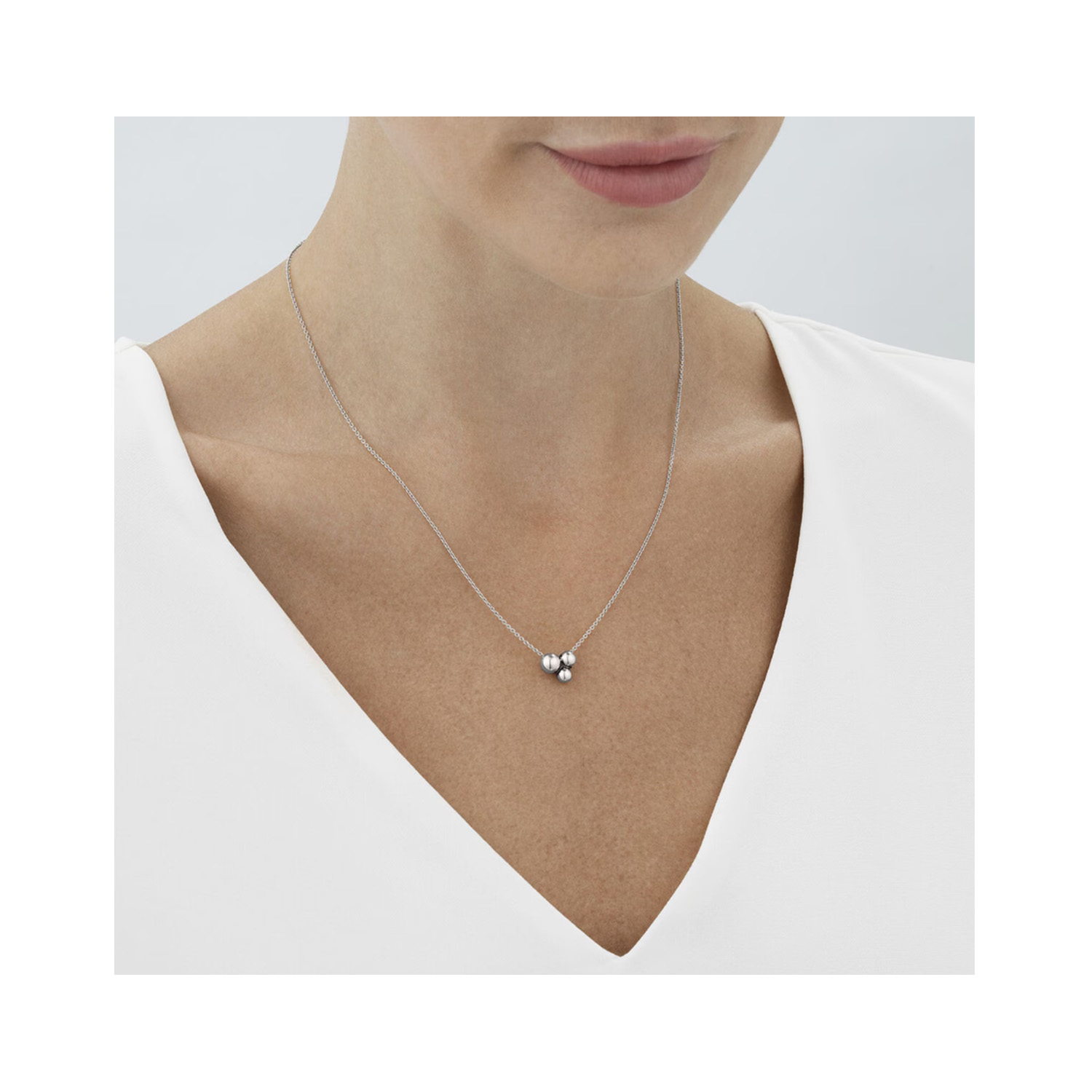 The Moonlight Grapes collection takes it’s inspiration from a decorative motif of grapes featured on historical silverware designed by Georg Jensen himself. This piece features a group of silver beads on a slim chain.
