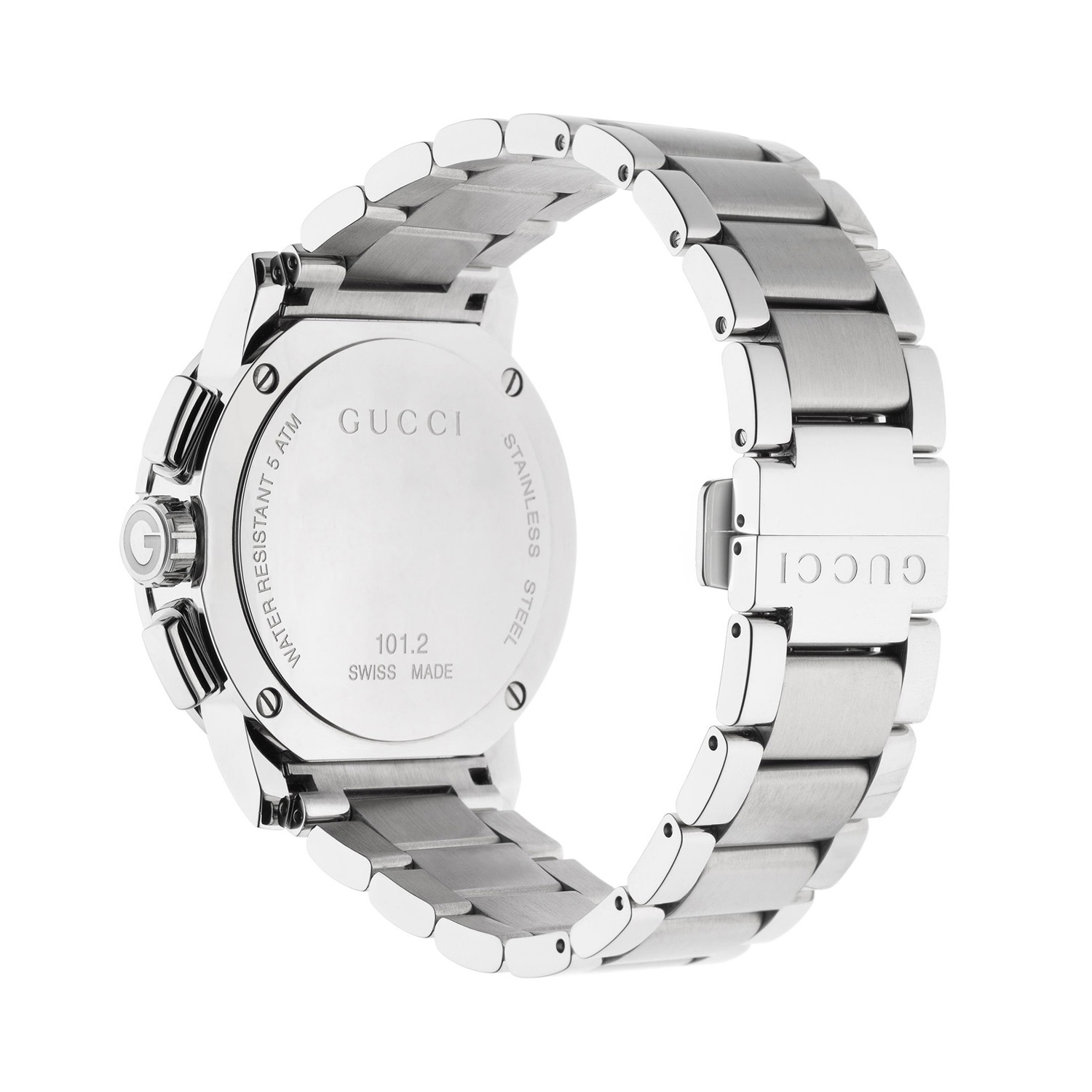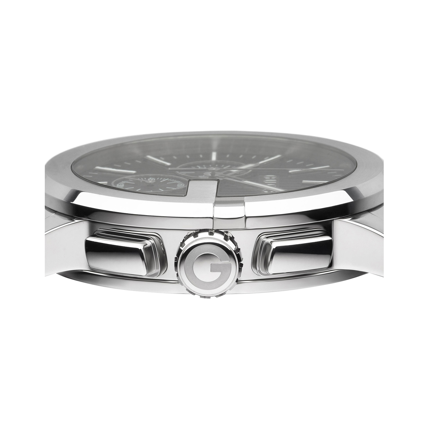 Gucci G-Chrono with a 44mm stainless steel case and bracelet strap featuring a chronograph and a black dial.