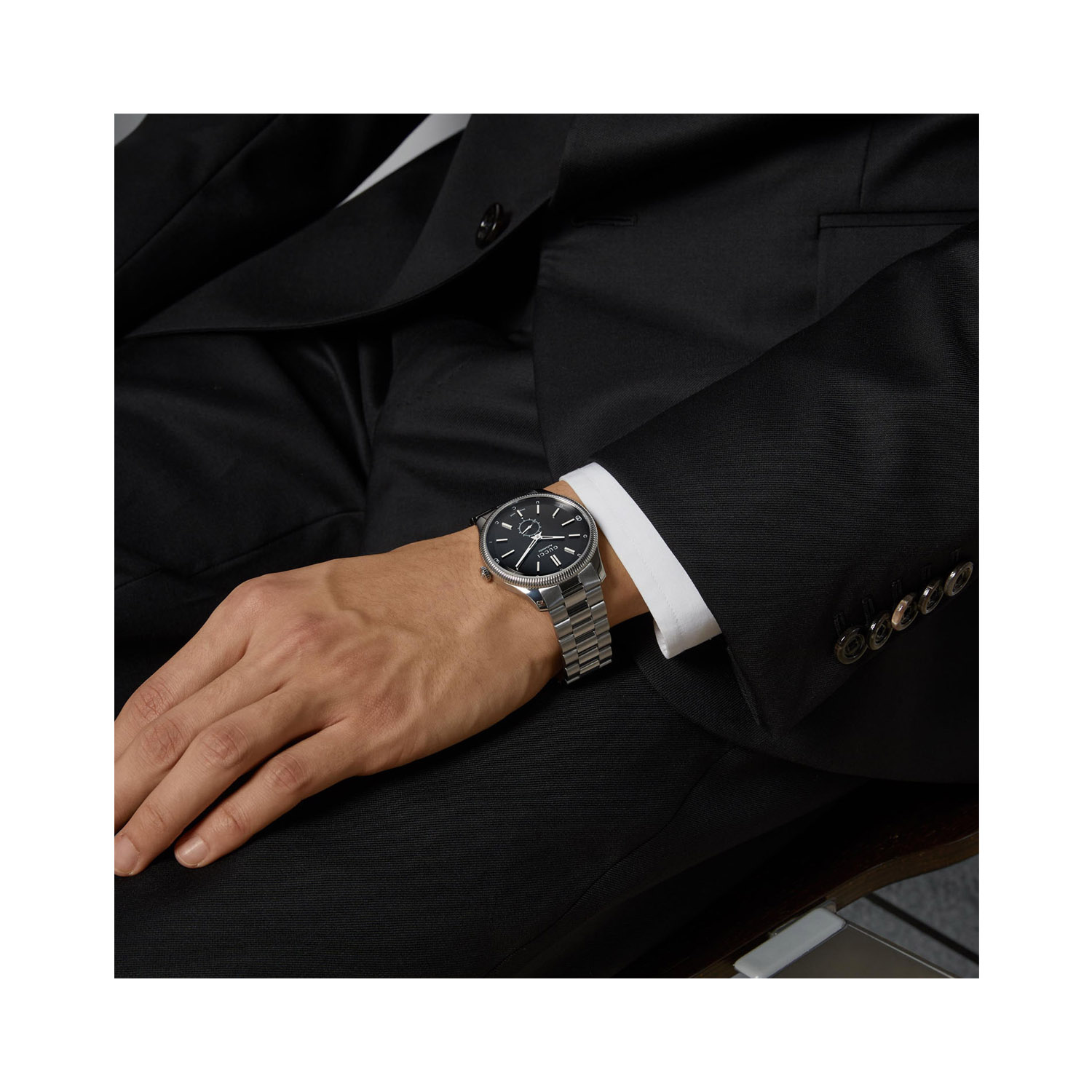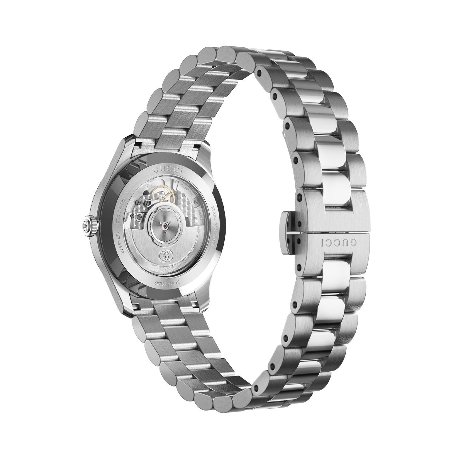 This new slim timepiece from the G-Timeless collection gives the wearer a sleek, polished style with subtle expressions of Gucci lettering and the signature motif around the dial. It features a small seconds hand at 6 o’clock and is powered by a Swiss-made automatic movement.