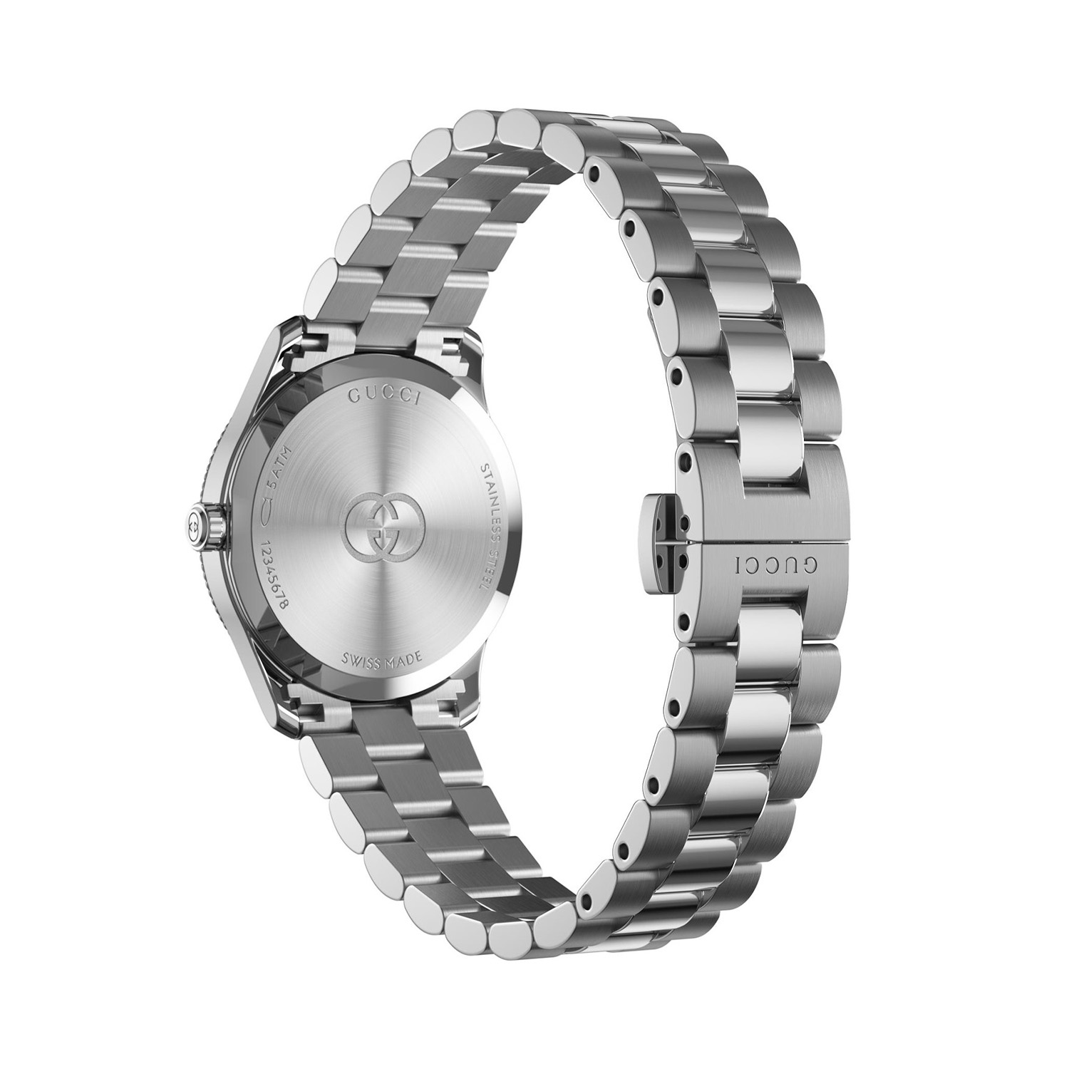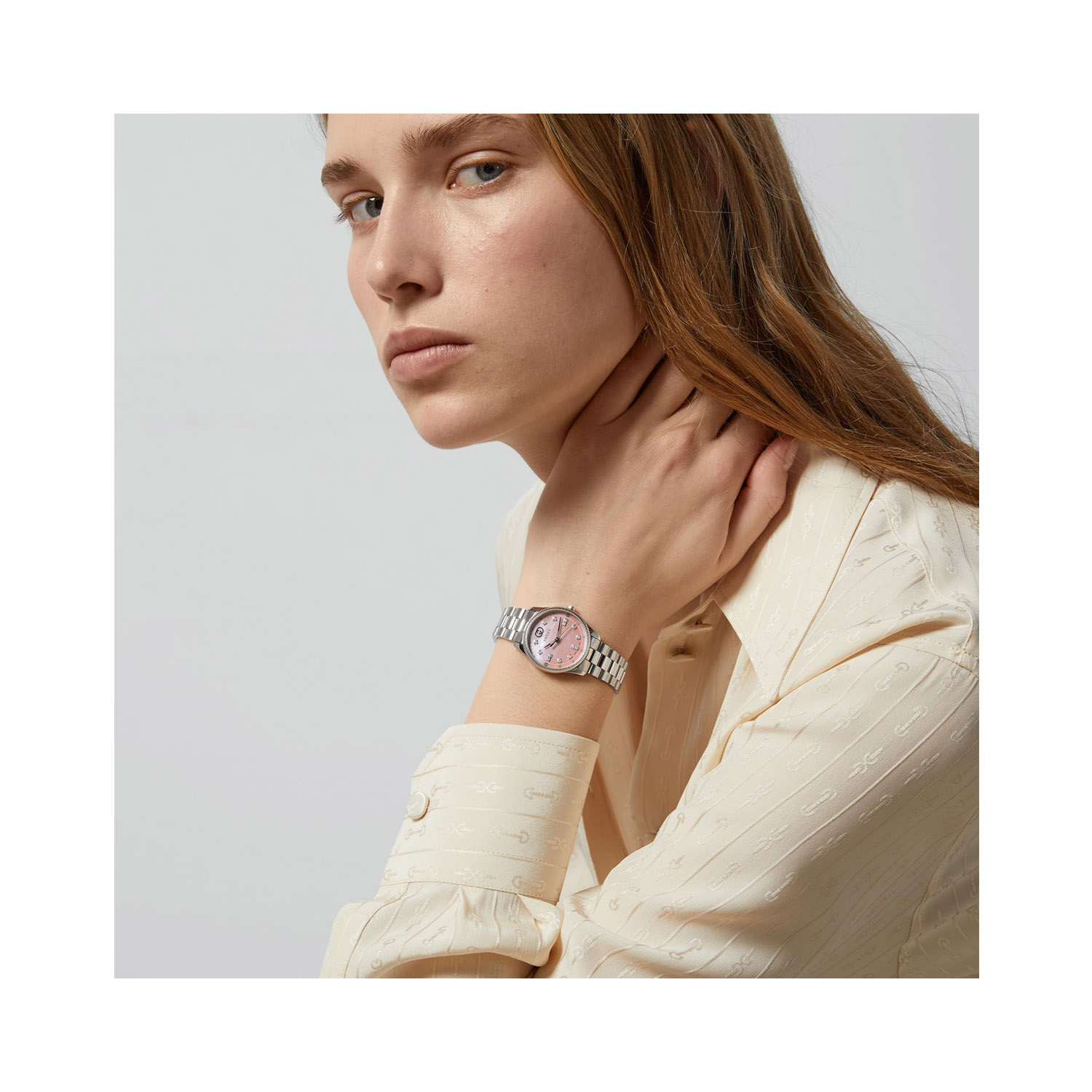 This new slim timepiece from the G-Timeless collection gives the wearer a sleek, polished style with subtle expressions of Gucci lettering and the signature motif around the dial. It features a beautiful pastel pink mother of pearl dial with diamond indexes.
