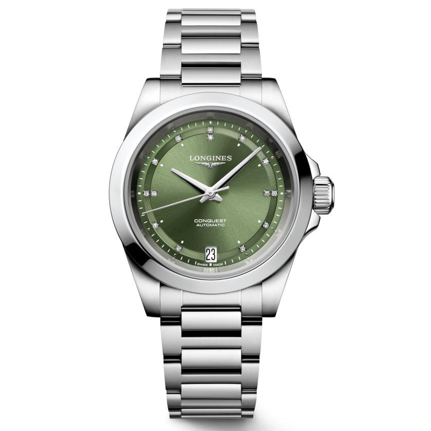 Longines, Conquest with a 34mm stainless steel case and bracelet strap featuring a date function and a sunray green diamond set dial.