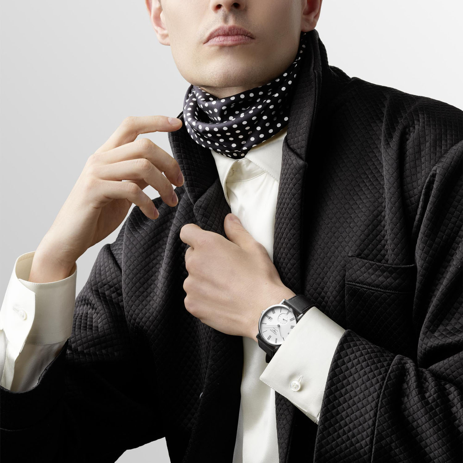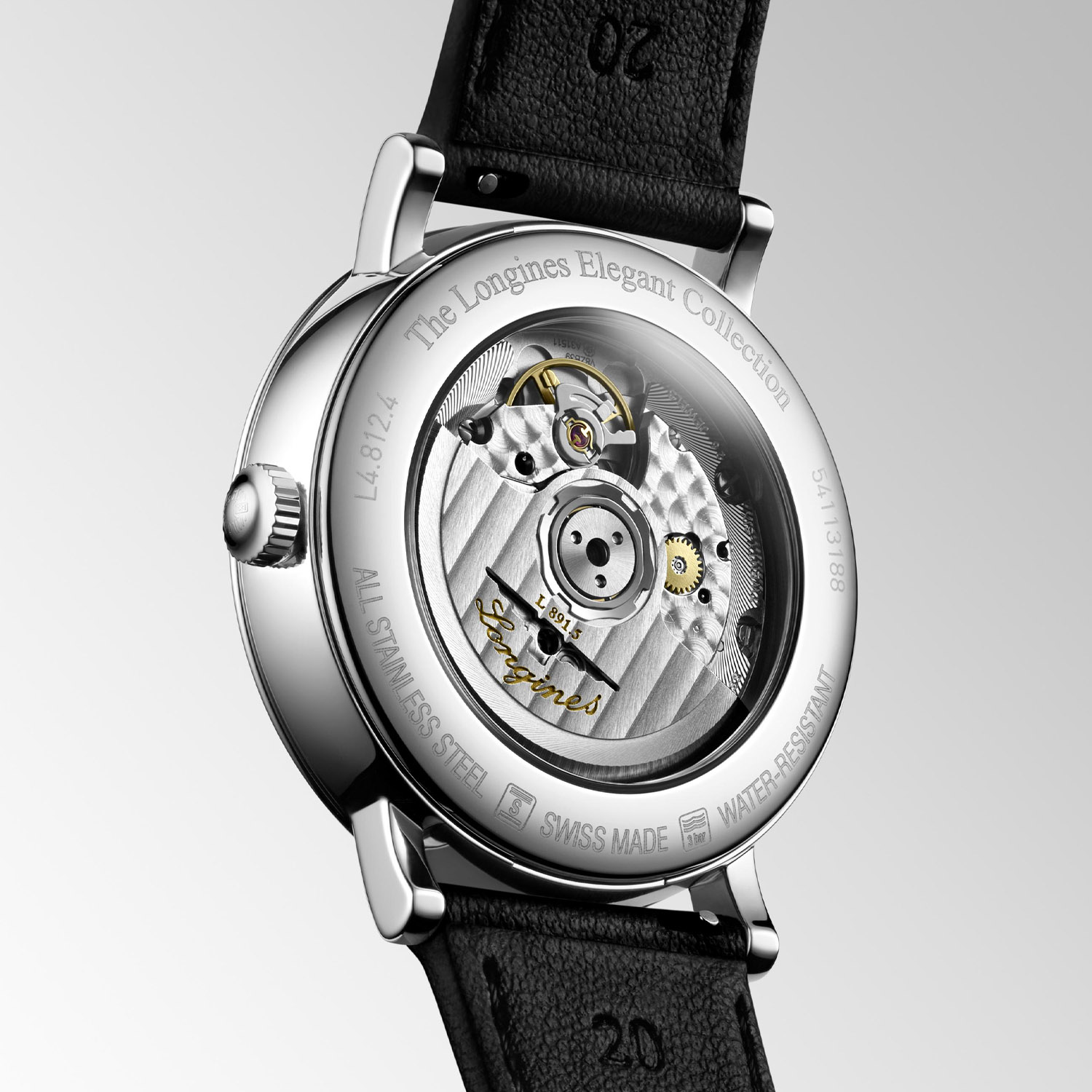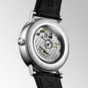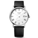 Longines, Elegant Collection with a 39mm stainless steel case and a black leather strap featuring a date function, small seconds hand and a white dial.