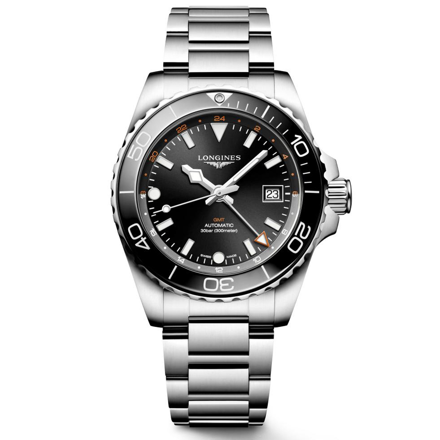 Longines, HydroConquest GMT with 41mm stainless steel case and bracelet strap featuring a date function and a black dial and ceramic bezel.