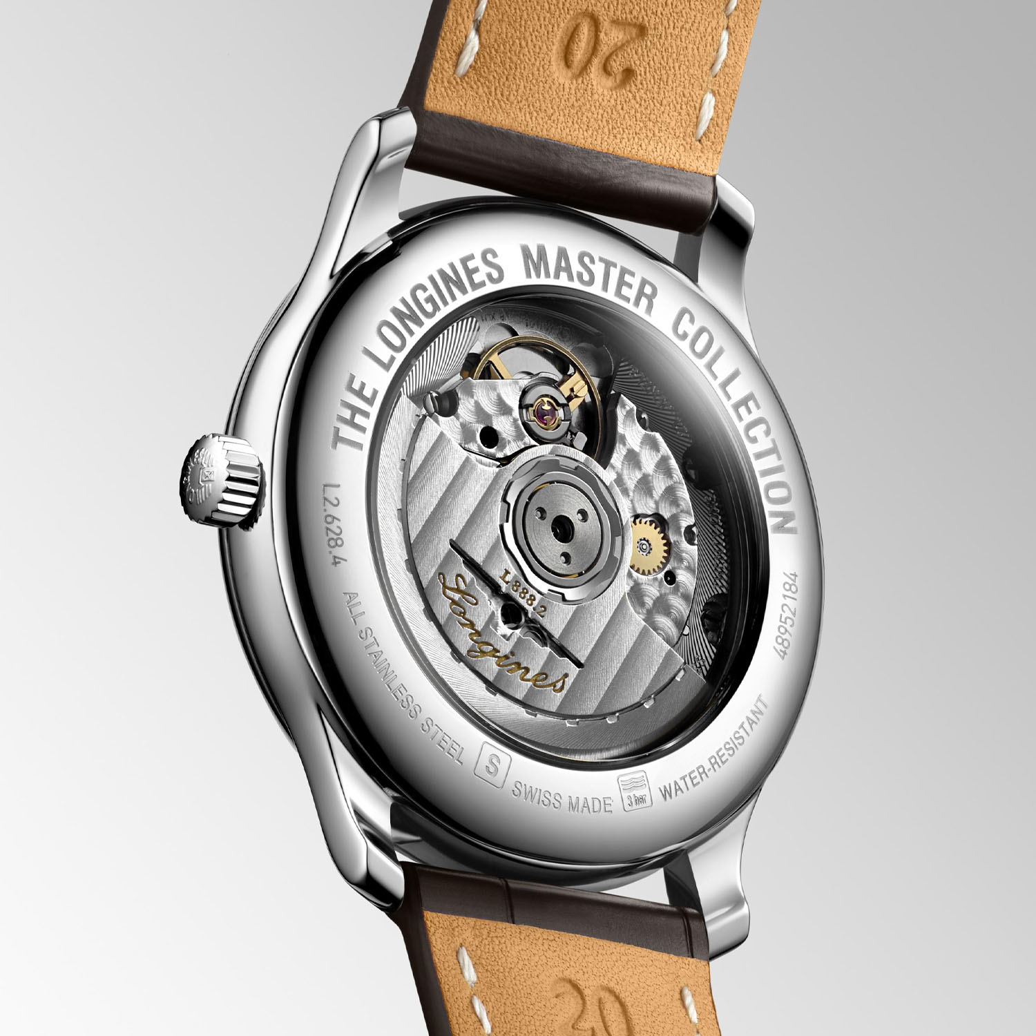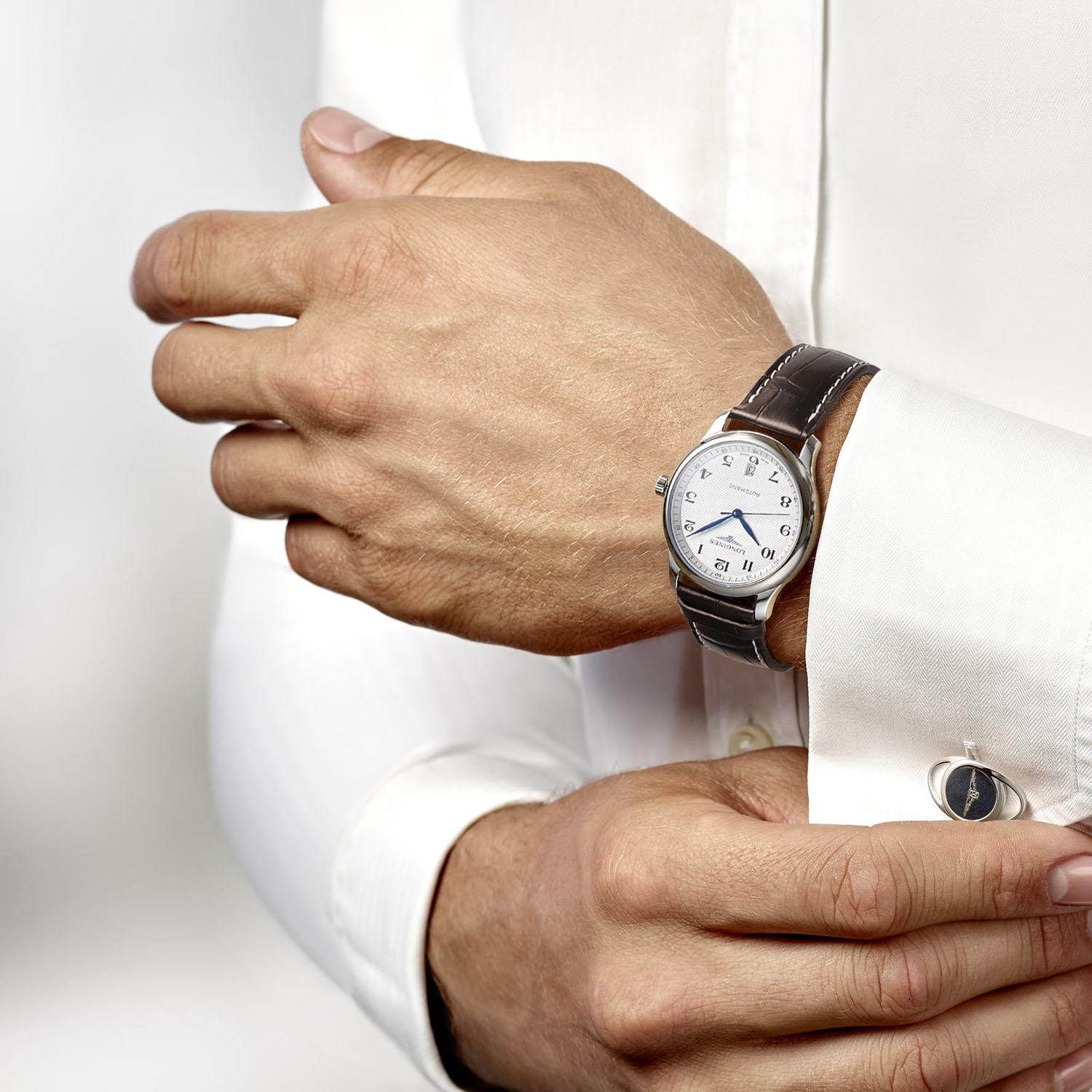 Longines, Master Collection with a 38.5mm stainless steel case and brown leather strap featuring a date function and a silver dial.