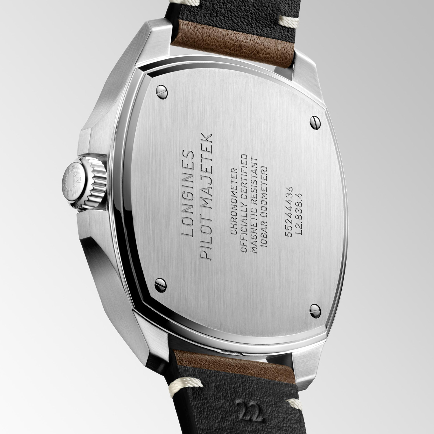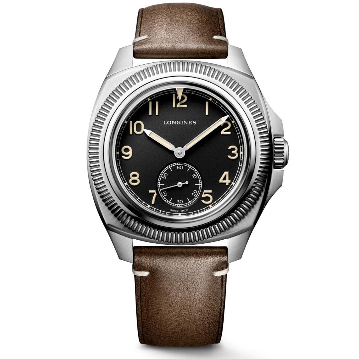 Longines, Pilot Majetek with a 43mm stainless steel case and a brown leather strap featuring a small seconds hand and a black dial.