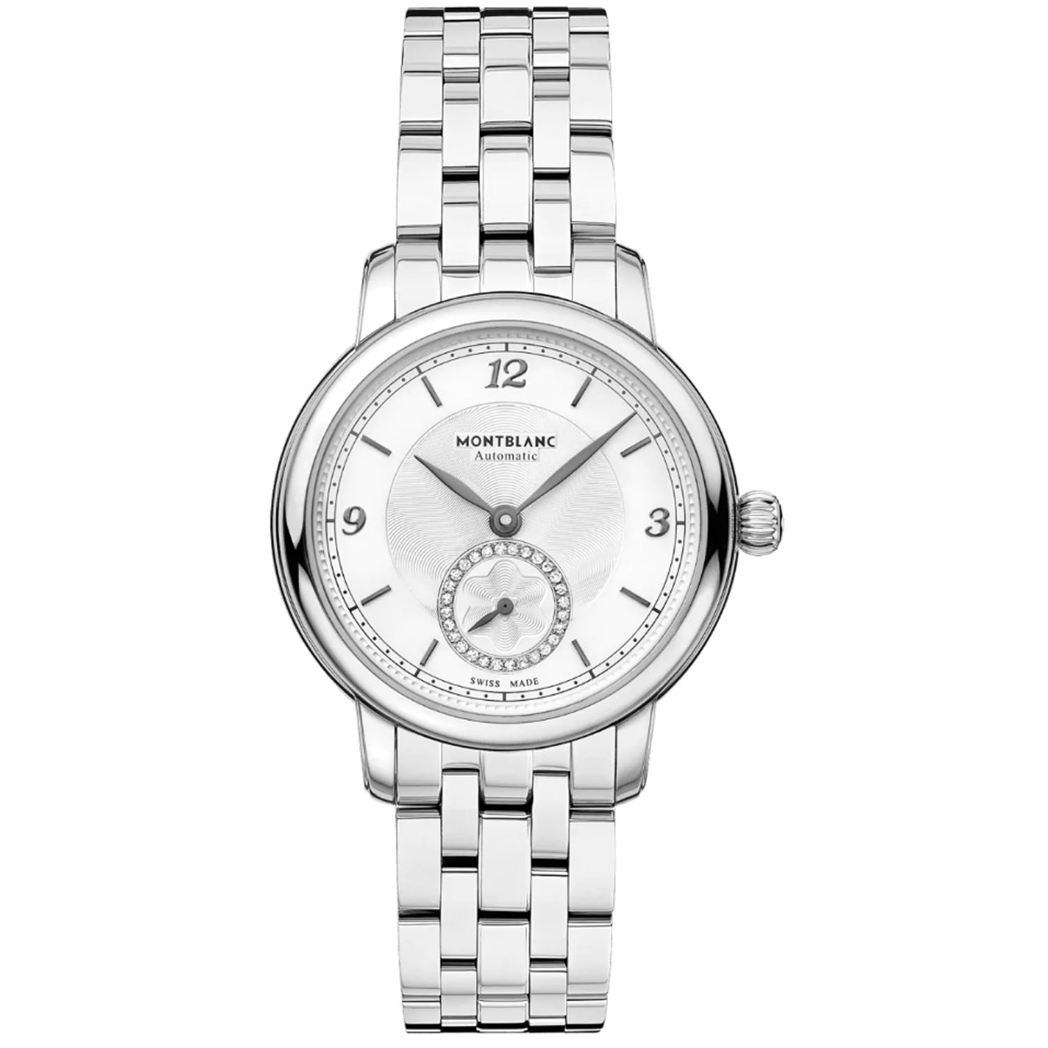 Montblanc, Star Legacy with a 32mm stainless steel case and bracelelet strap and a small second hand and a diamond set, white dial.