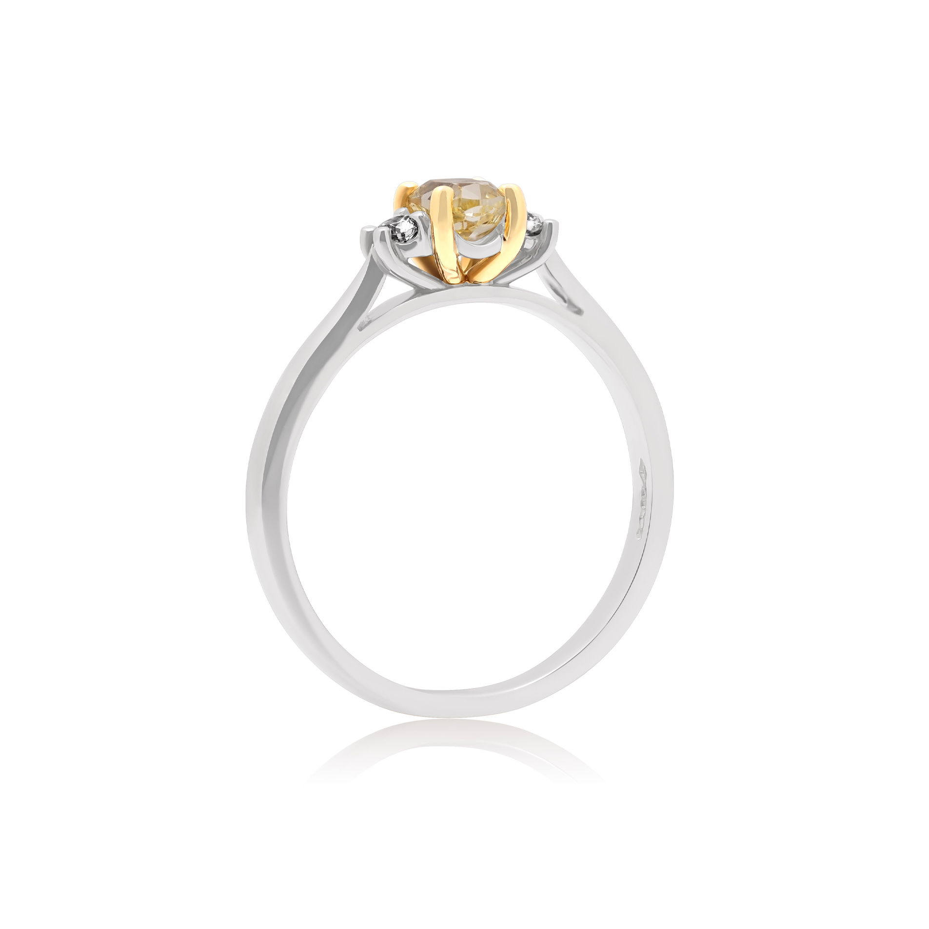 Platinum oval yellow diamond and brilliant cut diamond three stone ring with an 18ct yellow gold claw setting.