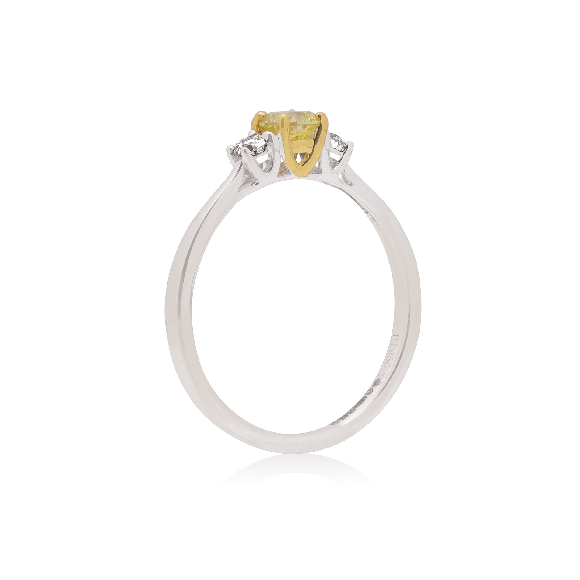 A platinum and 18ct yellow gold round brilliant cut diamond three stone ring, featuring a central fancy yellow diamond.