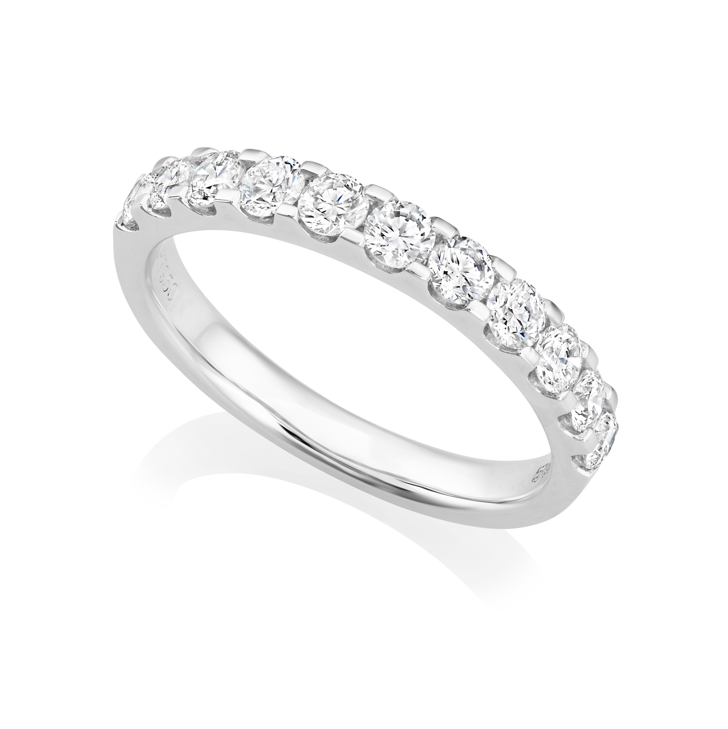 A platinum castle set eleven stone diamond half eternity ring. Also available in 18ct yellow gold.