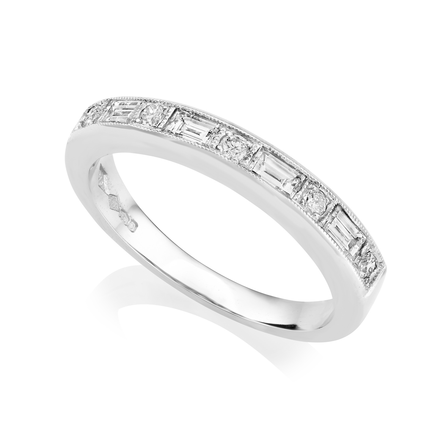 A platinum nine stone grain set eternity ring containing alternating baguette and brillaint cut diamonds.