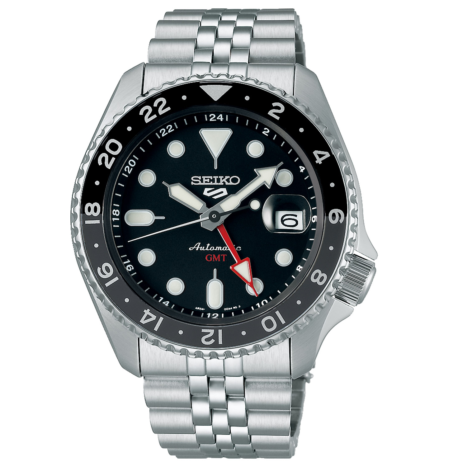 Seiko 5 Sports with a 42.5mm stainless steel case and bracelet strap featuring a date function, GMT function and a black dial and bezel.