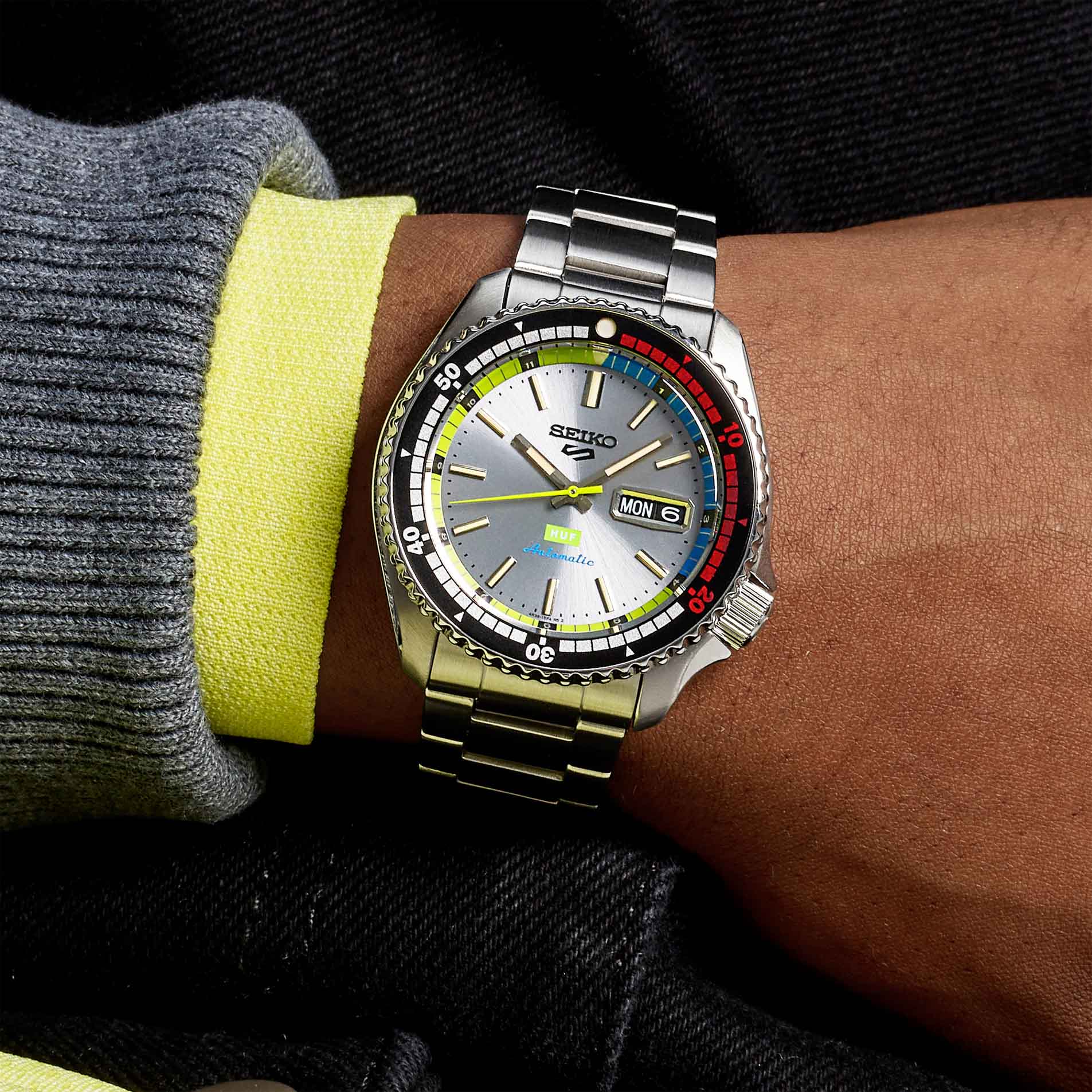 Seiko, 5 Sport X HUF Limited Edition Collaboration II with a 42.5mm stainless steel case and bracelet strap featuring a day date function and a silver dial.