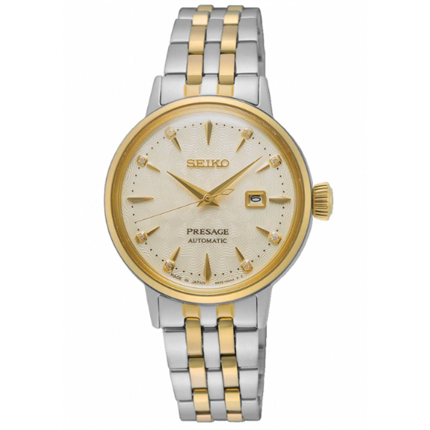 Seiko, Presage Cocktail Time ‘White Lady’ Diamond Twist with a 30.3mm stainless steel bi-colour case and bracelet strap featuring a date function and a diamond set white dial.