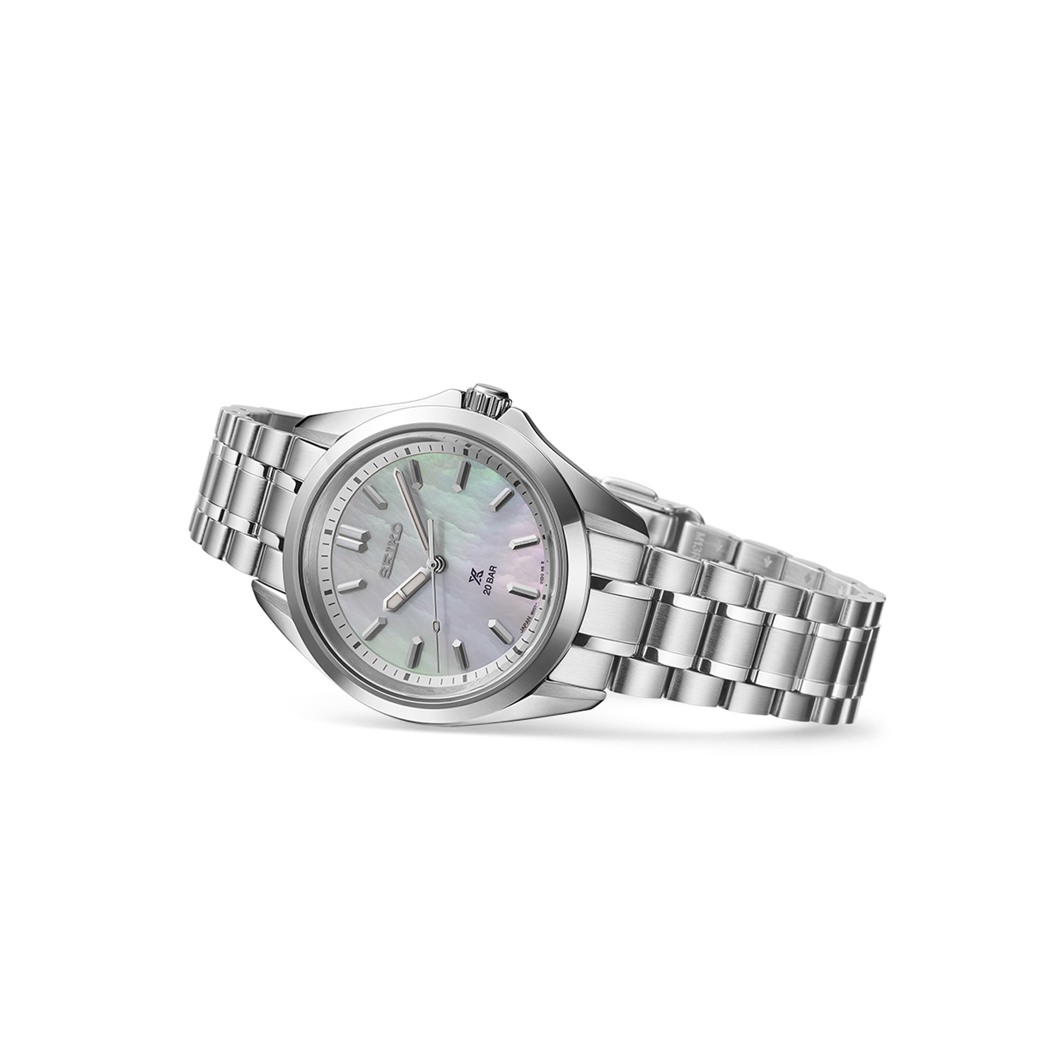 This watch is one of three new Prospex models combining the elegance of a dress watch with the robust functionality to use in marine sports. It is powered by a 6N01 quartz movement with a white mother of pearl dial set with baton hour markers.