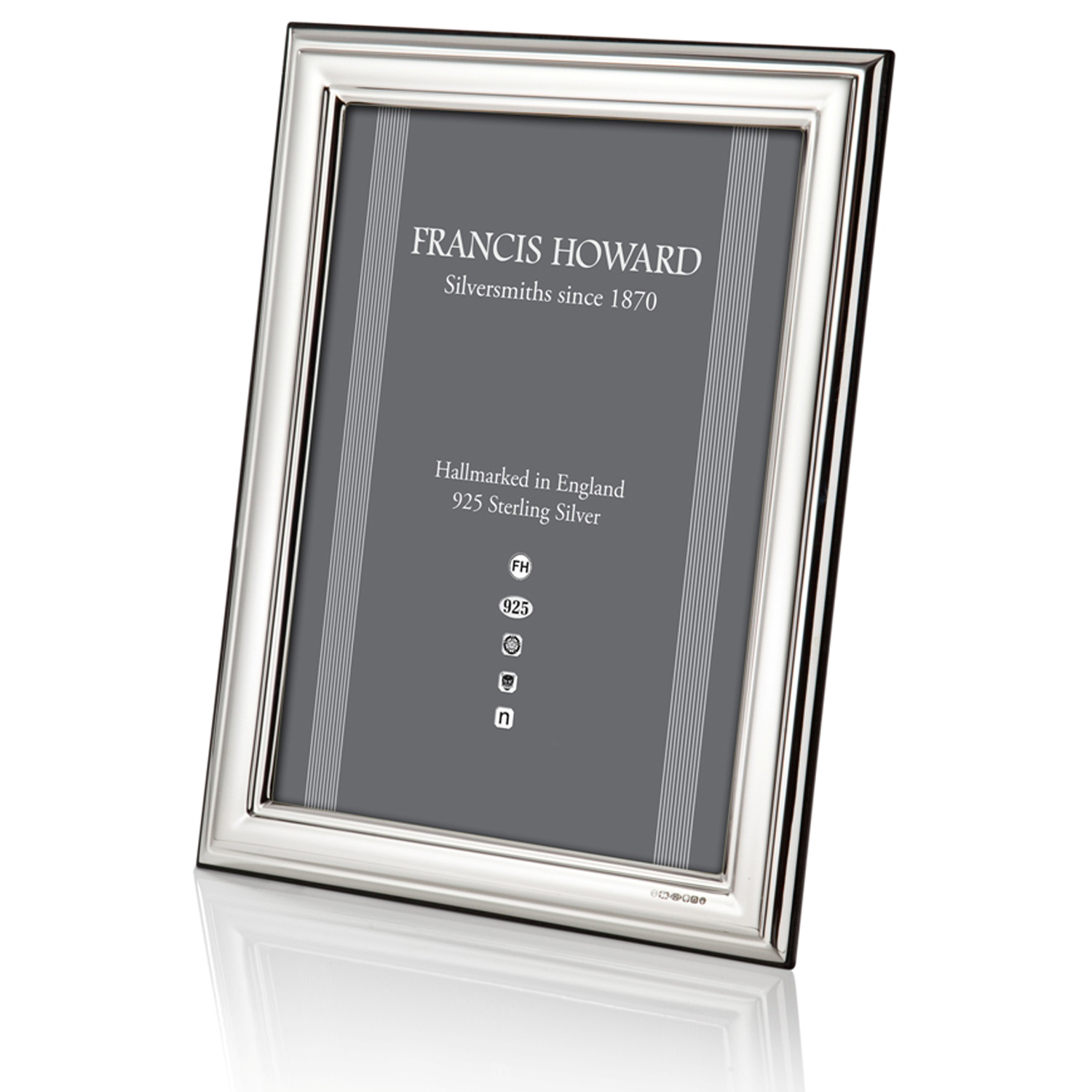 A hallmarked silver photograph frame from the ‘Chester’ range with a polished finish, bevelled edge and a wooden back.