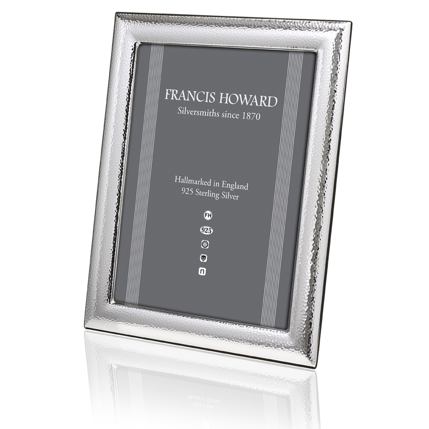 A hallmarked silver photograph frame from the ‘Edinburgh’ range with a hammered effect finish and a wooden back.