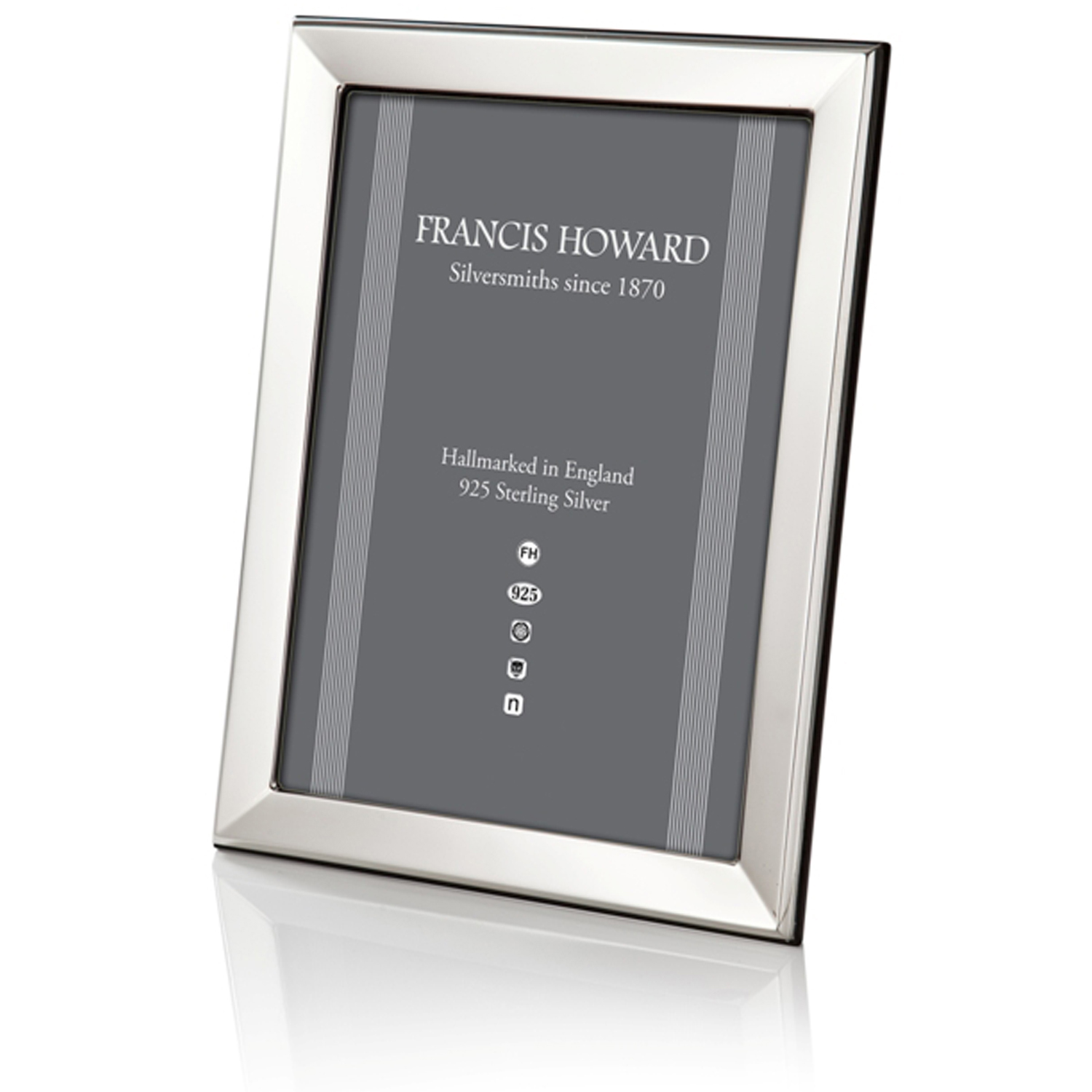A hallmarked silver photograph frame from the ‘Salisbury’ range with a polished finish and a wooden back.
