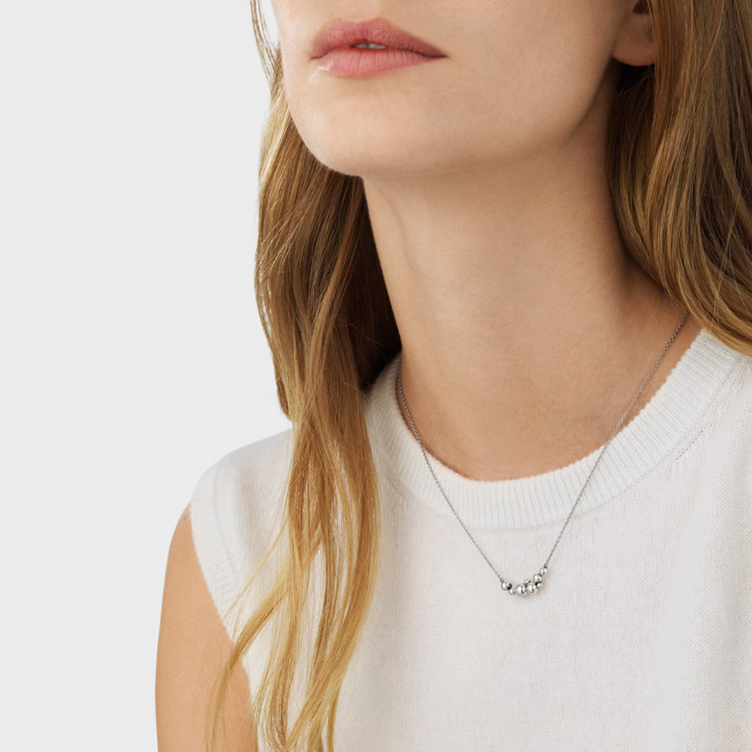 The Moonlight Grapes collection takes it’s inspiration from a decorative motif of grapes featured on historical silverware designed by Georg Jensen himself. This piece features a sweep of independently moving beads on a slim chain.