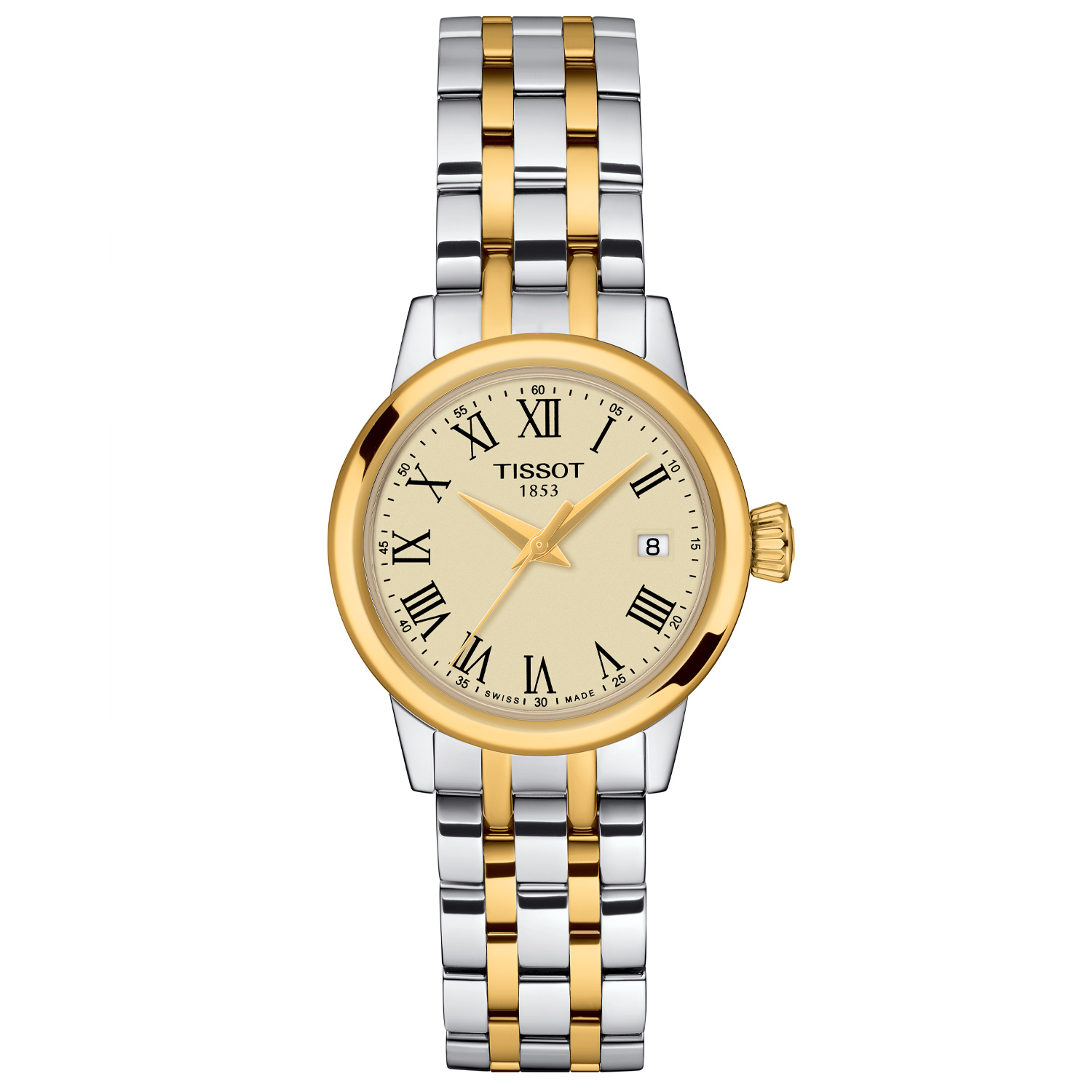 Tissot, Classic Dream Lady with a 28mm stainless steel and yellow gold PVD coated case and bracelet strap featuring a date function and an ivory coloured dial.
