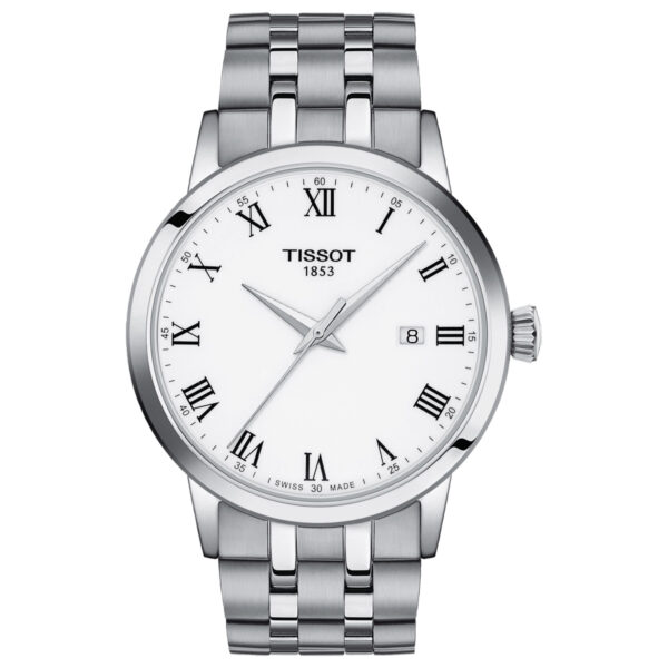 Tissot Classic Dream with a 42mm stainless steel case and bracelet strap featuring a date function and a white dial.