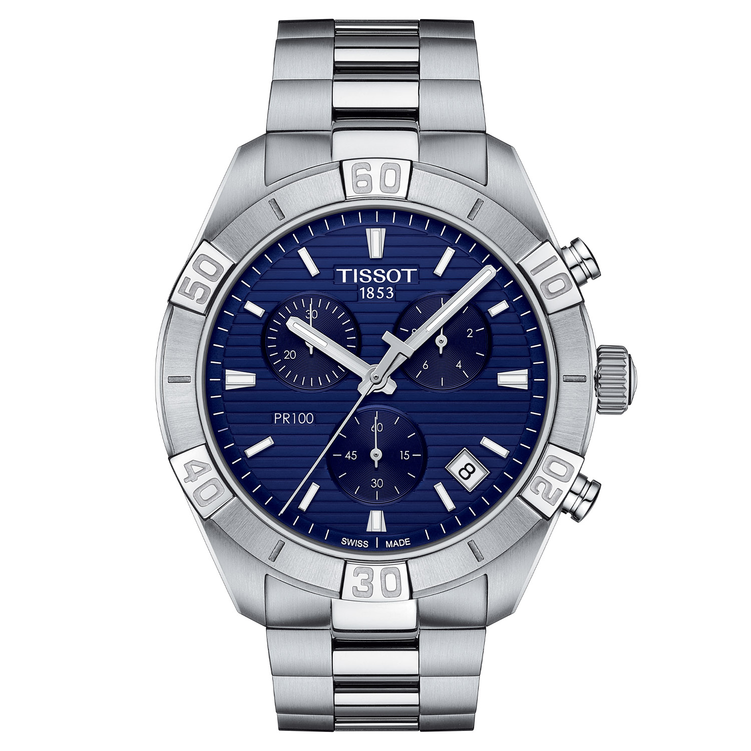 Tissot, PR 100 with a 44m stainless steel case and bracelet strap featuring a date function, chronograph and a blue dial.