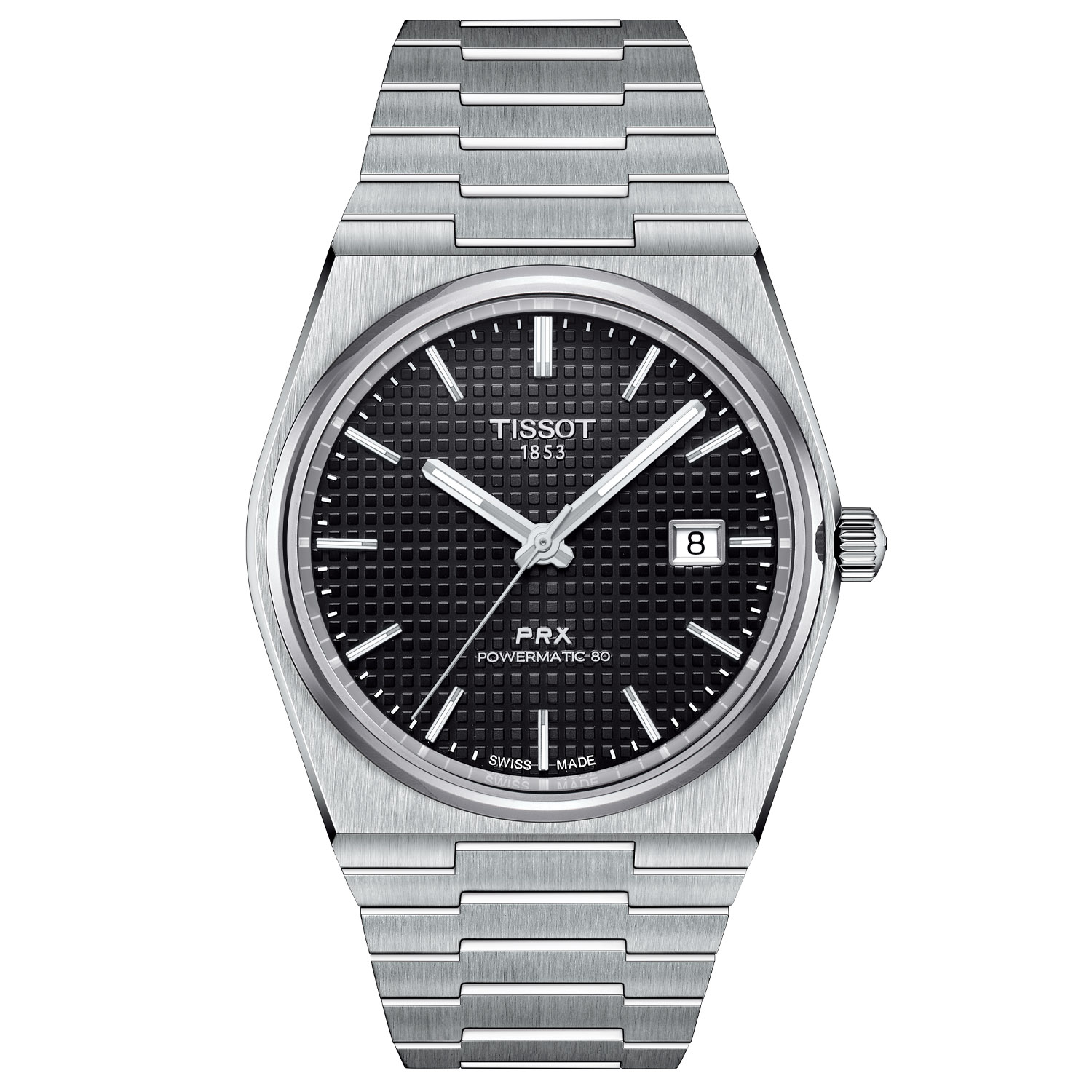 Tissot, PRX Powermatic 80 with a 40mm stainless steel case and bracelet strap featuring a date function and a black dial.